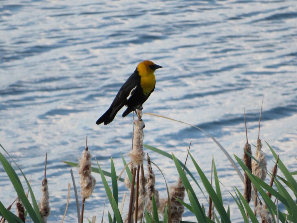 In conclusion, here are a couple of interesting facts about the Yellow-head: there are 9 other species that fall under the term “blackbird” here in North America, but of course the Yellow-Head is the most eye-catching. The second is that the oldest known Yellow-head was determined to be at least 11 years and 8 months old, as it was banded here in Saskatchewan in 1983 by one of Saskatoon’s best-known bird banders, Jim Slimmon, who now has a major street named after him that links our two naturalized parks. This bird was later found in Nebraska in 1995.