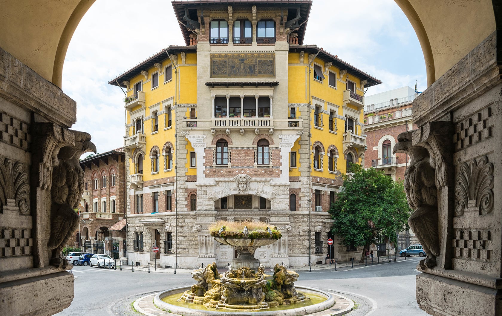 The Coppedè Quarter isn’t large and doesn’t take long to explore, but that’s part of its charm. Start at Piazza Buenos Aires, where there’s a convenient tram stop, and head down Via Tagliamento. You’ll soon pass beneath the grand arch of the Palazzo degli Ambasciatori, an entrance that feels more like stepping onto a film set than into a residential neighborhood. Continue on to Piazza Mincio, the heart of the quarter, where you’ll find the Fontana delle Rane (Fountain of the Frogs), a playful centerpiece surrounded by some of the area’s most imaginative buildings.